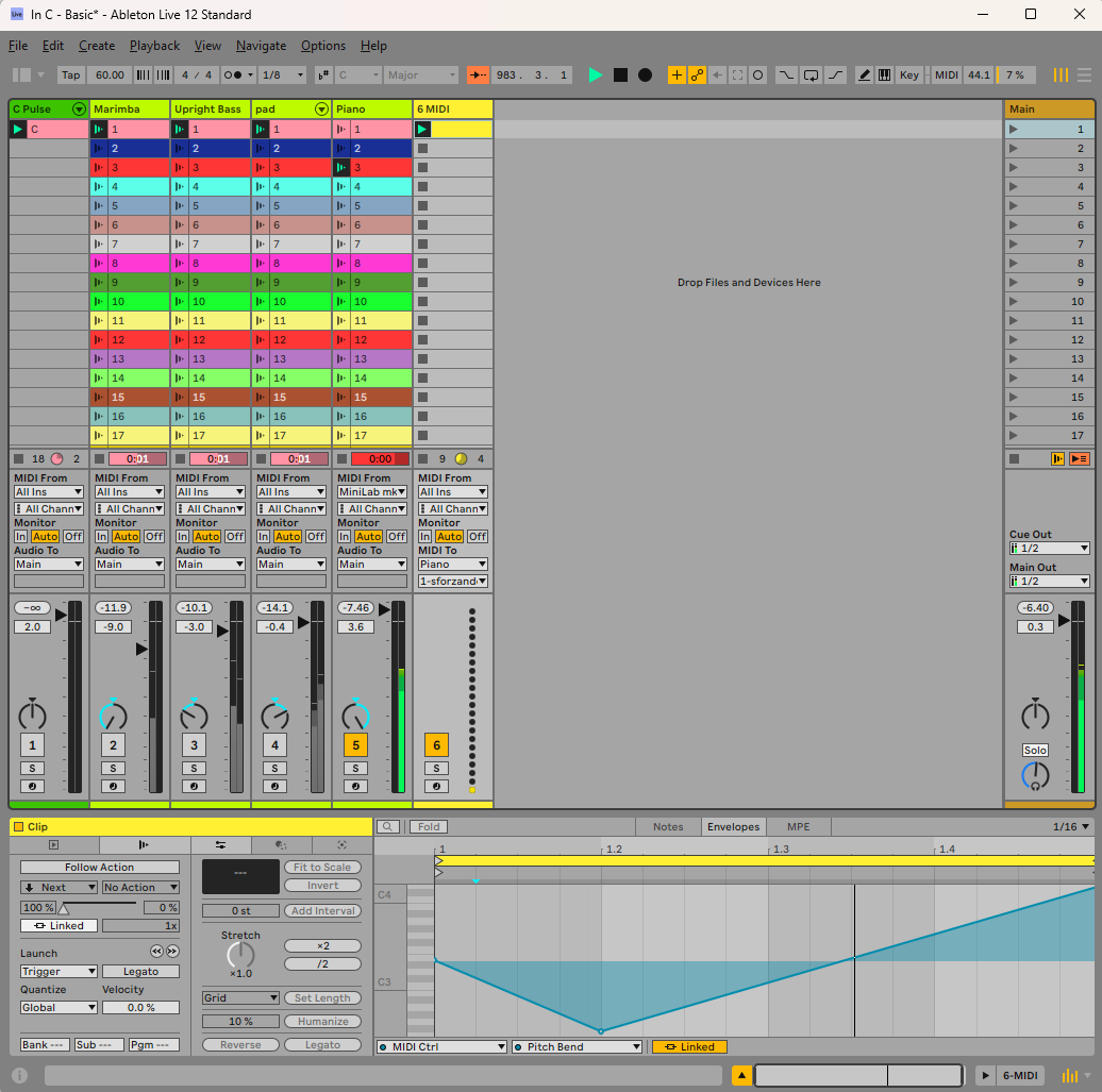 As well as doing it with clips full of notes, you can do it with envelope data as well. This is where I came slightly astray. If you set p a channel as in track 6 of this image, the envelope data will be sent to the assigned track, in this case “Piano”. The only trouble is, when you come to drawing your envelopes, you have to do it against the generic channel number rather than the controller name. So if you want to draw an envelope directly in a clip in the Piano track, you would see a list of all the available parameters at the bottom of the screen. If you do it in the “Midi” track, though, you just get a list of all the generic controller names. Unless you have a conversion chart from your VSTs creator, then it is trial and error trying to find the right one.
